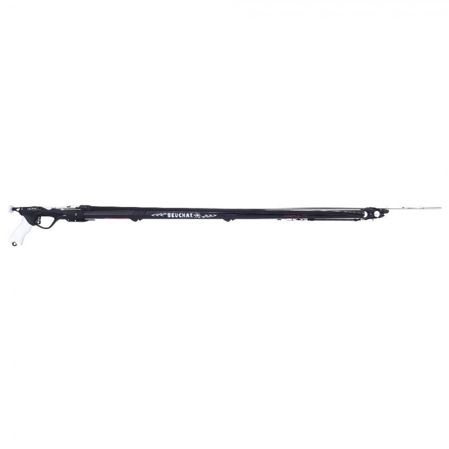 Arbalete con fusto in alluminio dal diametro di 28 mm e cm 115 di lunghezza, impugnatura marlin, testata aperta, elastici Megatone da 16 mm, ogiva articolata francese, asta da 6,5 mm, pronto pesca.